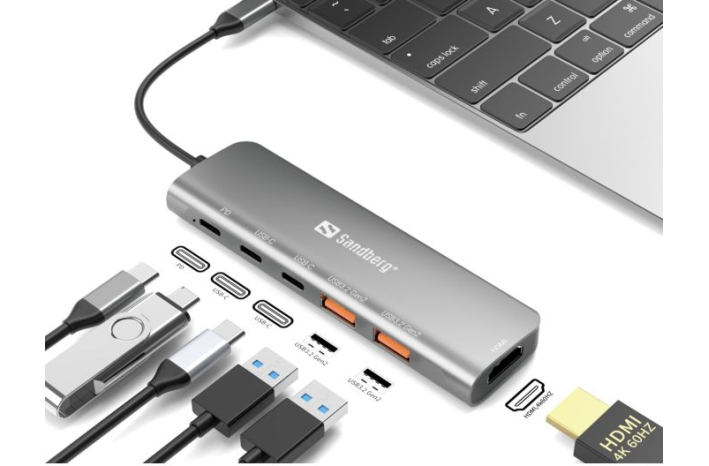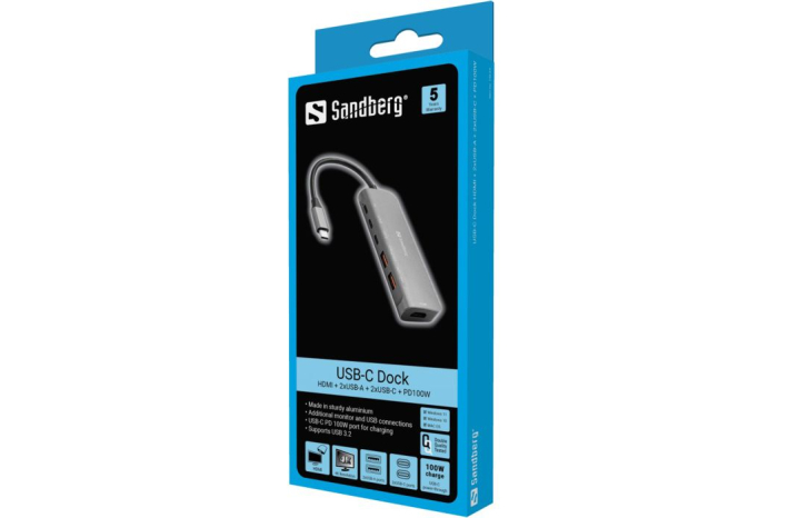 S Sandberg USB-C Dock HDMI + 2xUSB-A + 2xUSB-C + PD 100W priklopno postajo lahko svoj USB-C vhod uporabite za povezavo dodatnega zaslona, televizorja ali projektorja z računalnikom. Poleg tega sta na voljo dva USB-A vhoda za povezovanje USB naprav, dva USB-C vhoda in PD vhod za prenos napajanja, da se vaš MacBook/prenosnik ne izprazni med uporabo docka.