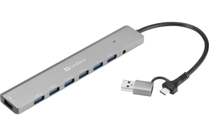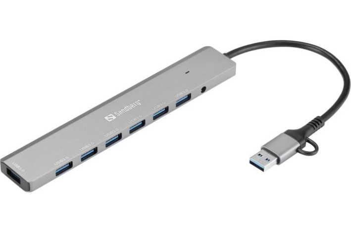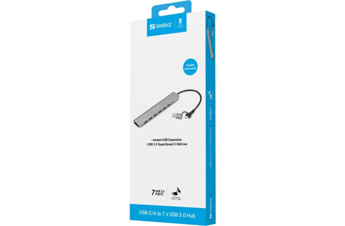 Sandberg USB-C/A v 7 x USB 3.0 Hub omogoča maksimalno svobodo povezljivosti. Povežite do 7 USB-A naprav, kot so zunanji trdi diski, tiskalniki, miške in druge periferne naprave. Hub je združljiv tako z modernimi prenosniki z USB-C kot tudi s starejšimi računalniki z USB-A.