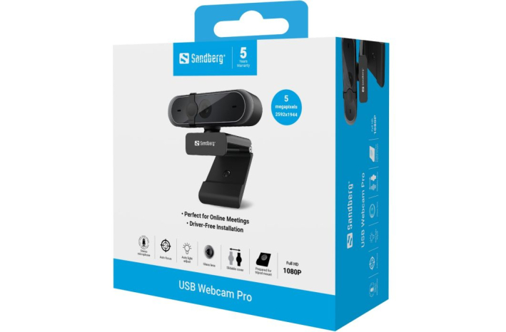 Sandberg USB Webcam Pro spletna kamera zagotavlja ostro in jasno sliko zahvaljujoč ločljivosti Full HD 1080p. Objektiv ima funkciji samodejnega ostrenja in samodejne prilagoditve svetlobe, zato vas sogovornik vedno vidi jasno. Vgrajen pokrovček za lečo omogoča, da po želji zaščitite svojo zasebnost. Kamera je nameščena na sponko, ki omogoča enostavno pritrditev na zaslon prenosnika ali podobne površine. Kamera je opremljena z vgrajenim stereo mikrofonom.