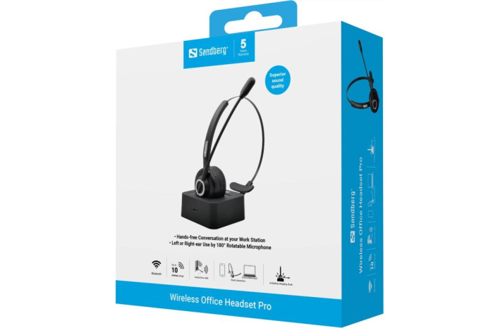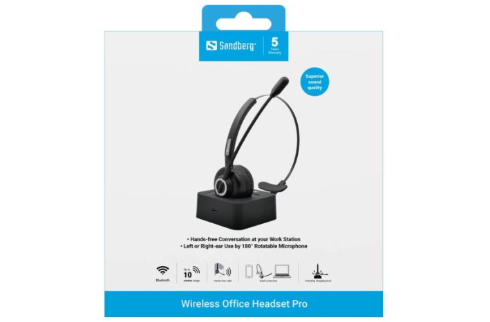Podatki o pakiranju: 1x Sandberg Wireless Office Headset Pro, 1x polnilna postaja, 1x polnilni kabel USB (80 cm)