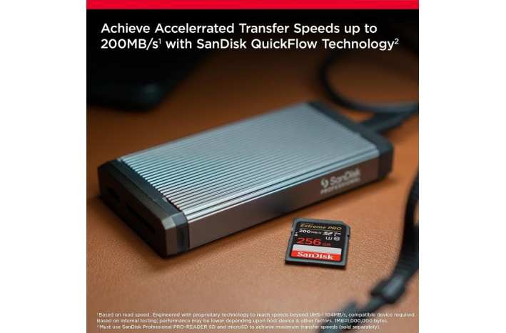 S tehnologijo SanDisk® QuickFlow™ Technology7 ta kartica optimizira zmogljivost za časovno varčno razkladanje medijev s hitrimi hitrostmi prenosa do 200 MB/s6 (64 GB - 1 TB). Povežite se s SanDisk Professional PRO-READER SD in microSD, da dosežete največjo hitrost (naprodaj posebej).