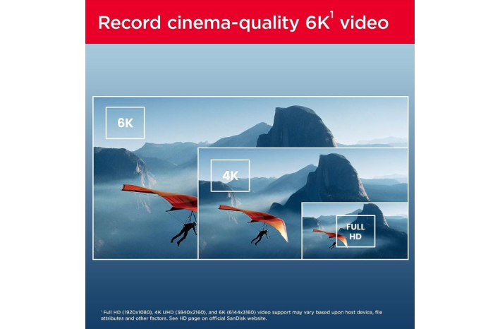 Dosezite profesionalne rezultate s snemanjem v super visoki ločljivosti. Razred video hitrosti 606 zagotavlja minimalno trajno hitrost zapisovanja 60 MB/s, kar zagotavlja zajem videa 6K1 kinematografske kakovosti v standardnih načinih snemanja. Zajemite briljantne videoposnetke 4K UHD1 v standardnem ali počasnem posnetku in Full HD1 v super počasnem posnetku, da dobite posebne učinke, ki jih želite.