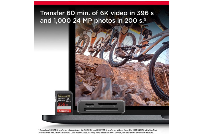 Porabite manj časa za razkladanje svojih fotografij in video datotek s hitrostjo prenosa do 280 MB/s9. Združite se z bralnikom več kartic PRO-READER podjetja SanDisk Professional, da omogočite najvišje hitrosti in visoko trajno zmogljivost (naprodaj ločeno).