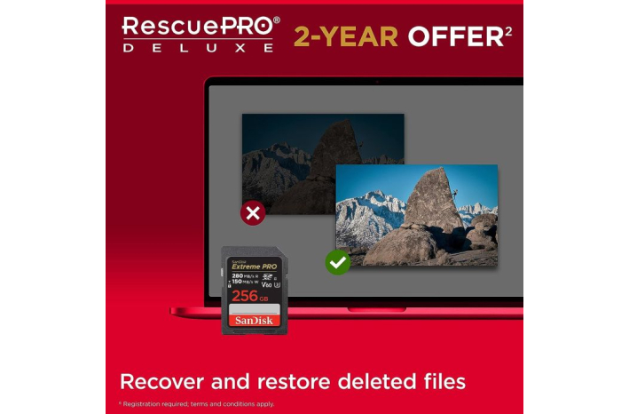 Z zanesljivimi karticami SanDisk Extreme PRO® SDXC™ UHS-II razreda 60 razreda 606 snemajte izjemen videoposnetek 6K1 ter neprekinjen zaporedni način in slike s časovnim zamikom. Shranite več vsebine visoke ločljivosti z možnostmi zmogljivosti do 1TB10 in obnovite pomotoma izbrisane datoteke z 2-letno ponudbo storitve za obnovitev datotek RescuePRO® Deluxe2.