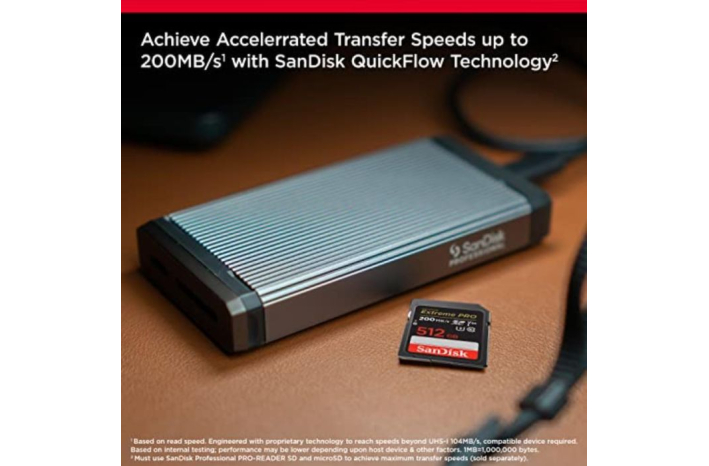 S tehnologijo SanDisk® QuickFlow™ Technology7 ta kartica optimizira zmogljivost za časovno varčno razkladanje medijev s hitrimi hitrostmi prenosa do 200 MB/s6 (64 GB - 1 TB). Povežite se s SanDisk Professional PRO-READER SD in microSD, da dosežete največjo hitrost (naprodaj posebej).