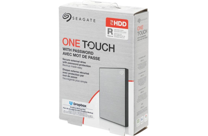 Seagate One Touch (STKY2000401) je robusten 2 TB USB 3.0 zunanji disk s kovinsko ohišje in strojno šifrirano zaščito z geslom. Ponuja sekvenčno prenosno hitrost do 130 MB/s in deluje brez namestitve programske opreme. Naprava vključuje funkcijo samodejnega varnostnega kopiranja prek orodja Toolkit, Rescue Data Recovery, leto dni naročnine Mylo Create in štirimesečno naročnino Adobe Creative Cloud Photography. Združljiv je z operacijskimi sistemi Windows, macOS in Chrome OS, brez potrebe po preformatiranju.