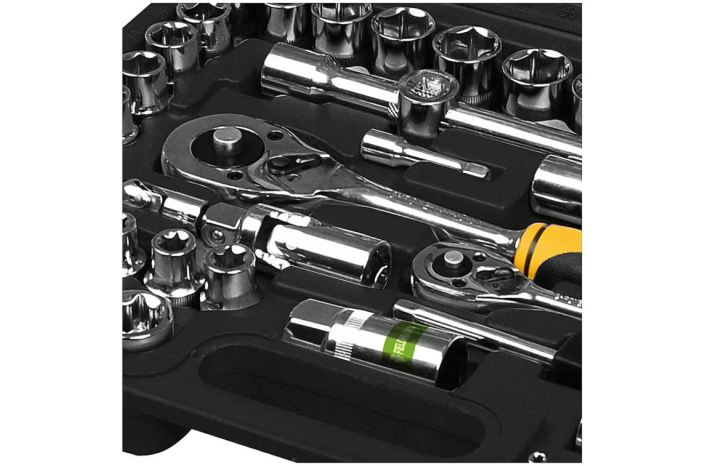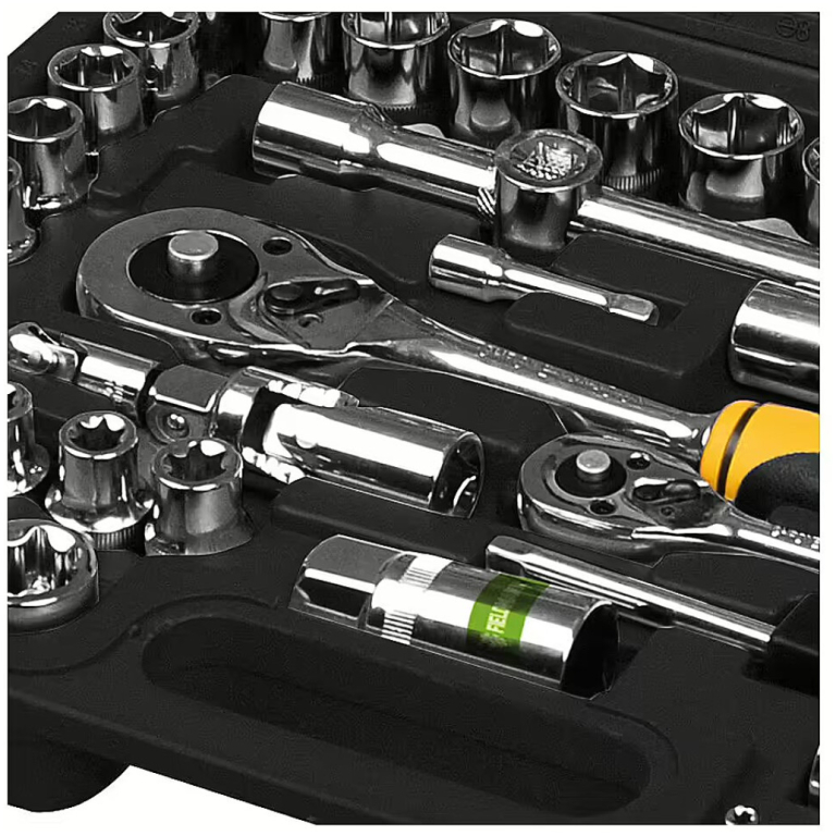 Komplet vsebuje tako 1/2" kot 1/4" raglje z ustreznimi nasadnimi glavami za obe velikosti, kar omogoča široko paleto uporabe. V setu boste našli dolge in kratke nasadne glave ter dve posebni glavi za vžigalne svečke motorja. Poleg tega je priložen odvijač za 1/4" glave z različnimi nastavki, kar še dodatno razširja možnosti uporabe tega kompleta.