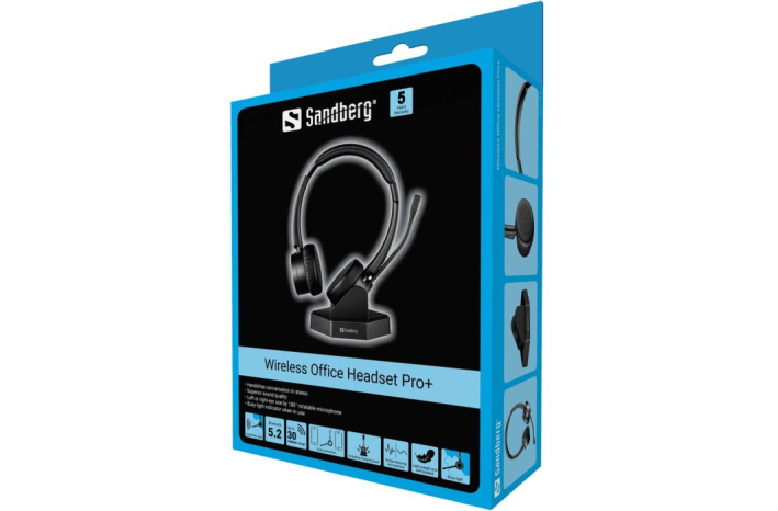 Sandberg Wireless Office Headset Pro+ so stilske in izjemno udobne brezžične stereo slušalke z mikrofonom, optimizirane za uporabo z mobilnim telefonom ali za pogovore preko spleta na vašem osebnem računalniku. Slušalke zagotavljajo kristalno jasno reprodukcijo glasov. Slušalke z mikrofonom je možno hkrati povezati z dvema napravama; na primer, tako z vašim osebnim računalnikom kot z vašim mobilnim telefonom. Vgrajena svetleča dioda »zasedenosti« vašim sodelavcem sporoča, da ste zasedeni s pogovorom preko slušalk. Paket vključuje elegantno postajo, v kateri lahko slušalke z mikrofonom polnite, ko jih ne uporabljate.