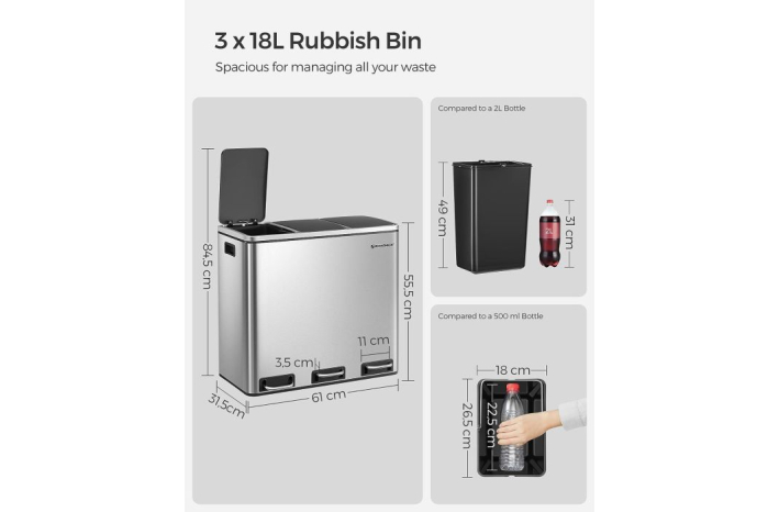 Kaj dobite: Črn koš za smeti s 3 predali x 18 l, priročnimi pedali in odstranljivimi notranjimi vedri za enostavno odstranjevanje odpadkov in brezskrbno recikliranje.