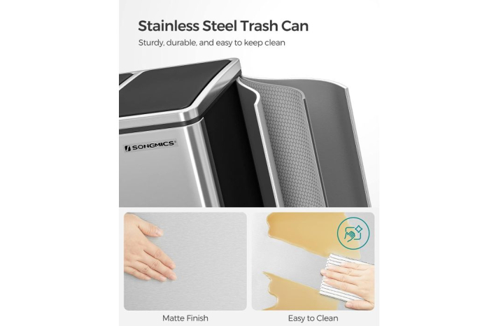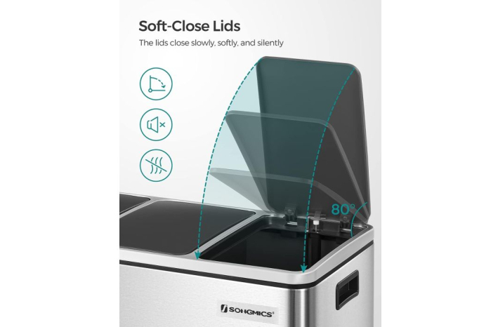 Ima mehko stran: Koš za odpadke je sicer izdelan iz toge jeklene zunanjosti, vendar je nežen - zaradi varovalnega mehanizma se pokrovi zapirajo mehko, počasi in neslišno, tako da se bakterije in neprijetne vonjave zadržujejo brez glasnega brnenja.