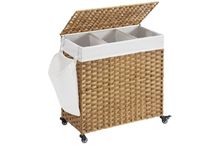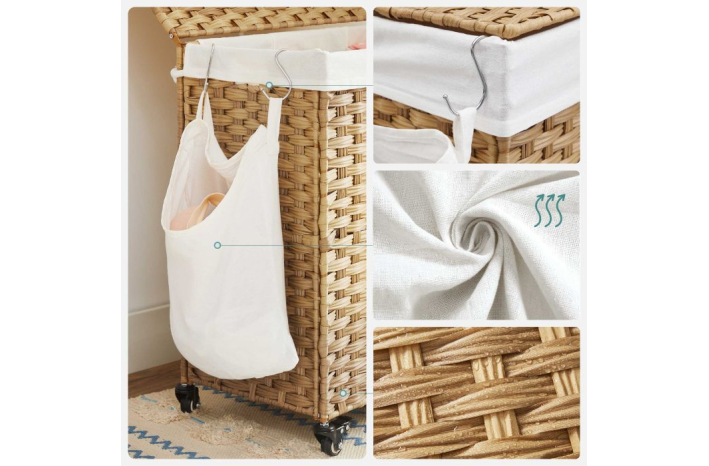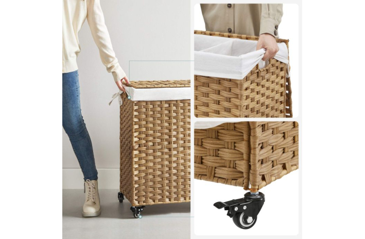SONGMICS koš za perilo, ročno tkani koš za perilo, 140-litrski koš za perilo iz ratana s 3 predali, odstranljiva podloga, ročaji, pokrov, dnevna soba, kopalnica, 66 x 33 x 60 cm, naravni LCB363N01