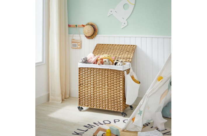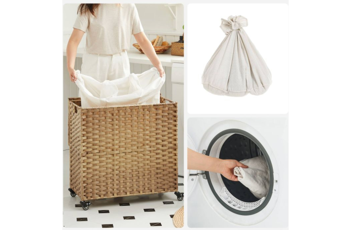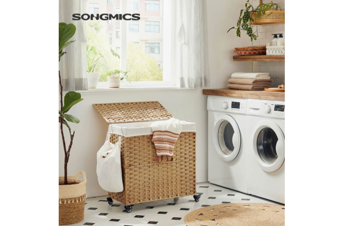 Koš za perilo ima 4 kolesa (4 imajo zavore), zato ga lahko premikate ali po potrebi držite na mestu, kolesa pa lahko zamenjate tudi z nogami; za premikanje je vključen tudi dolg pasni ročaj