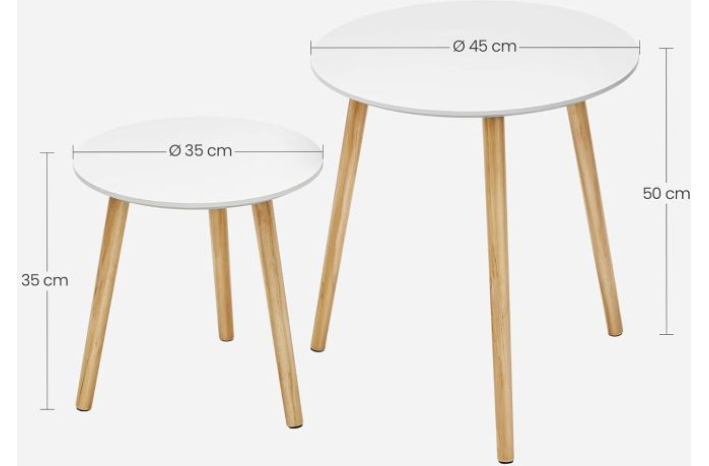 Vsestranska - Dimenzije velike mize: Premer 45 cm, višina 50 cm, dimenzije majhne mizice: premer 35 cm, višina 35 cm: Mizici lahko uporabljate kot kavno mizico, stransko mizico, stolček za rastline ali nočno omarico, samostojno ali v kompletu.