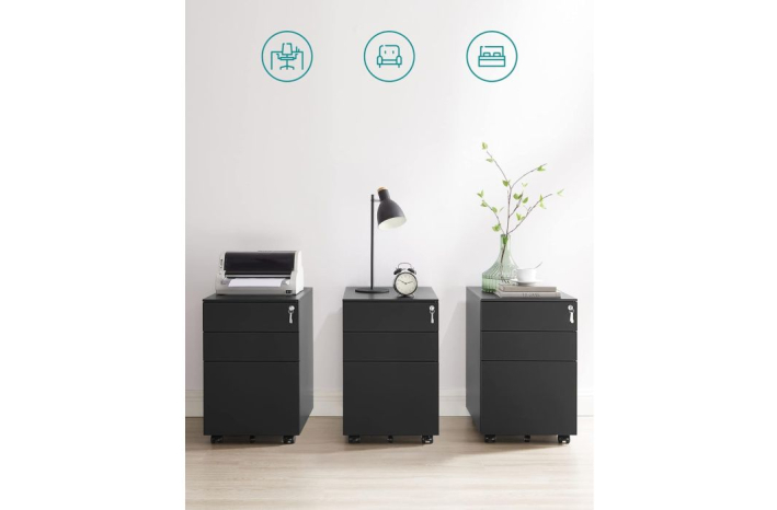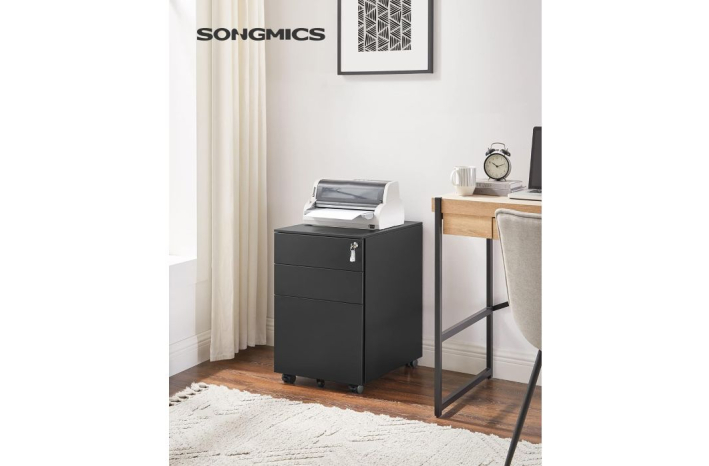 - Kaj prejmete: SONGMICS pisalno omarico z 3 predali, 1 organizatorjem predalov, 1 obešalno palico za mape in 5 kolesi (2 imata zavore za mirno stojišče, 1 je na sredini za stabilnost). Postavite svojo pisarno v red!