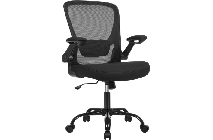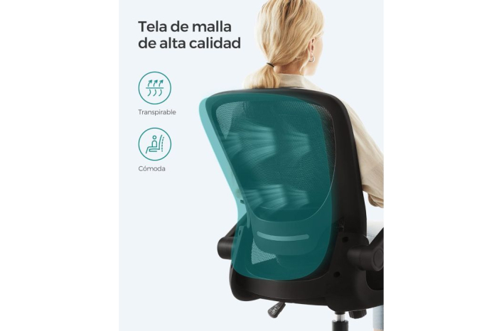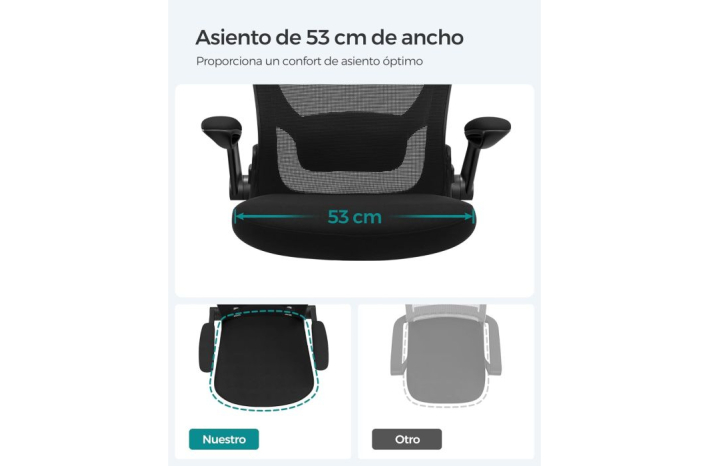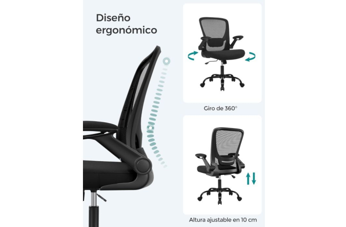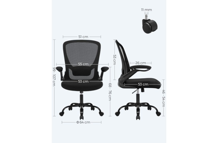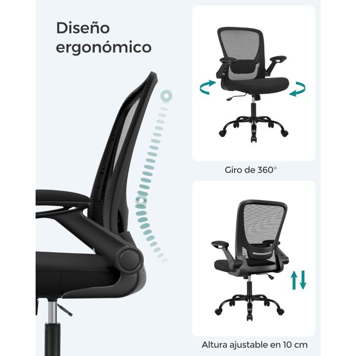 SONGMICS pisarniški stol, pisarniški stol, mrežasti vrtljivi, ergonomski računalniški stol, ledvena podpora, nihajoči, sedež 53 cm, zložljivi nasloni za roke, črn OBN37BK