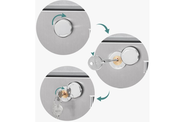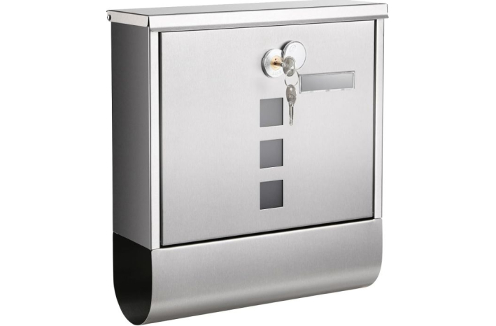 Izdelan iz nerjavečega jekla s krtačeno mat površino in visokokakovostnim lakiranjem. Zaklepanje je zagotovljeno s cilindrom iz bakra, ključavnica pa ima vrtljiv pokrov, ki ščiti pred dežjem. Ta nabiralnik učinkovito preprečuje rjavenje.