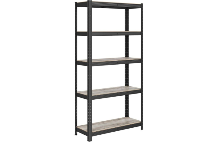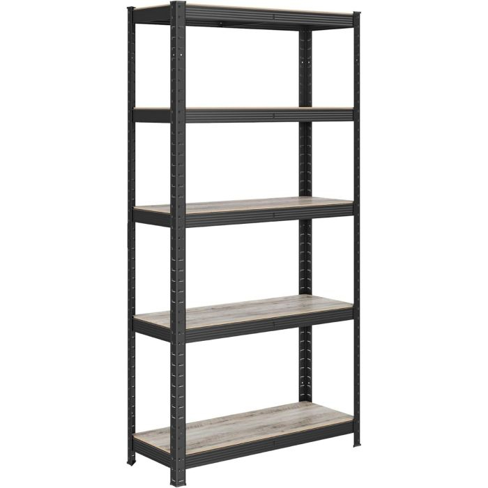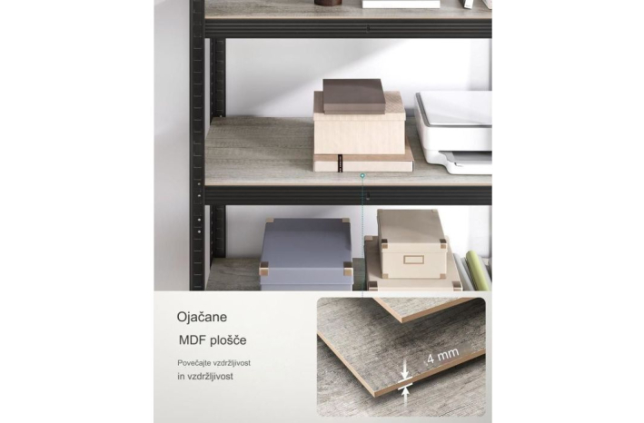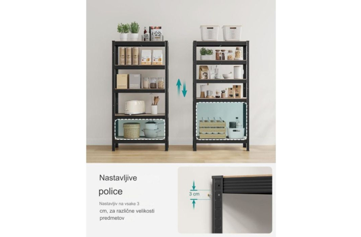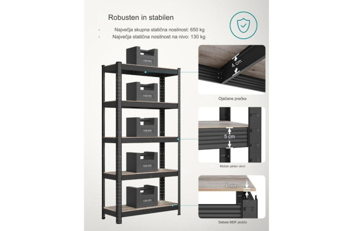 Podrobnosti o izdelku:Barva: naravna črnaMaterial: prašno lakirano jeklo, MDF (vlaknena plošča srednje gostote)Velikost posamezne police: 150 x 75 x 30 cm (v x d x š)Teža posamezne police: 8,1 kgMaksimalna statična nosilnost posamezne police: 80 kg