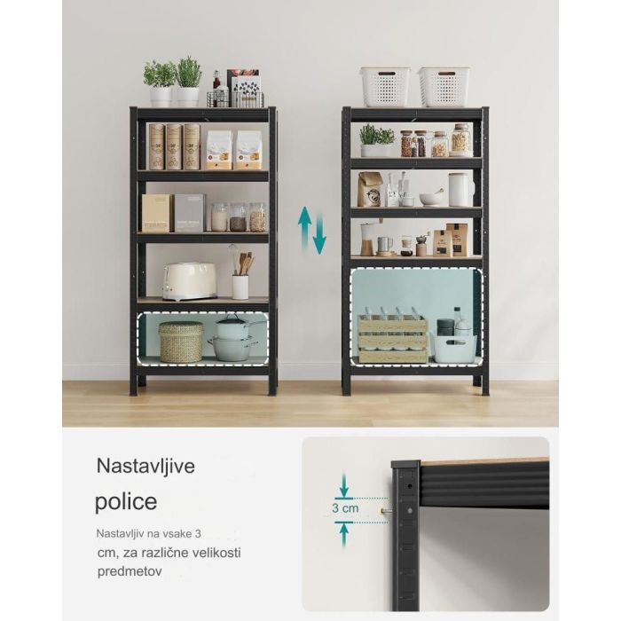 Glavni razlogi, zakaj je ta regalni sistem SONGMICS pravi za vas:jekleni okvir in police iz MDF zagotavljajo močno oporo.ojačitve na nogah in prečke pod vsako stopnjo police povečujejo stabilnost.prašni premaz je odporen na rjo in obrabo.vsaka polica prenese obremenitev do 80 kg.razdaljo med posameznimi stopnjami police lahko prilagodljivo nastavite. Polico lahko razdelite tudi na dva dela, priložena zaščita proti pretihotapljanju pa zagotavlja varno uporabo. edinstven videz te odlagalne police doda dekorativni pridih vaši dnevni sobi, balkonu, pisarni ali kuhinji.