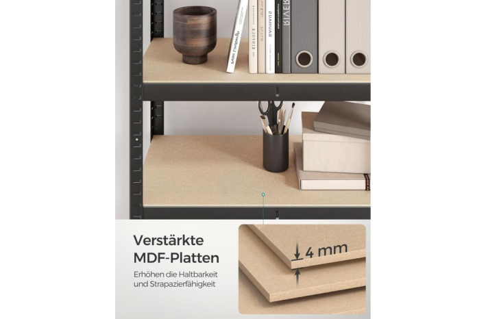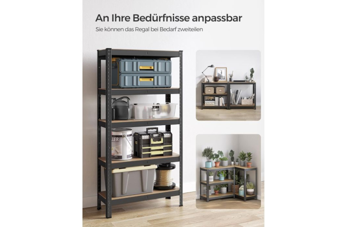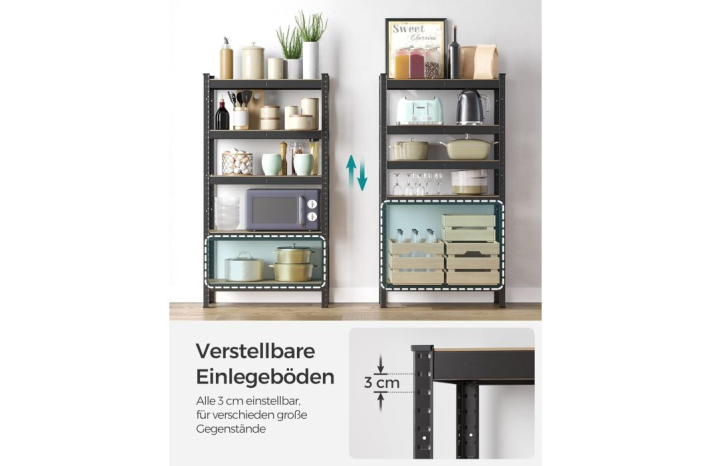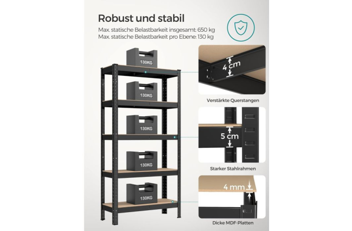 težka polica je izdelana iz jeklenega okvirja, vsaka polica lahko prenese do 130 kg. S priloženo zaščito za nagib lahko polico pritrdite na steno, zato je bolj stabilna in varna.