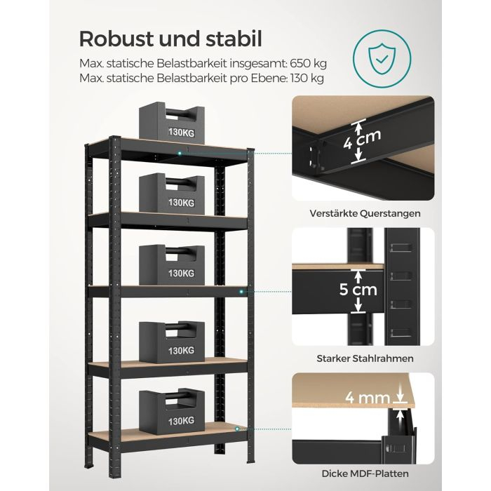 Polica velikosti 30 x 75 x 150 cm lahko nosi do 650 kg. Polico lahko uporabite v garaži, shrambi ali kleti za organizacijo vsega orodja in opreme.