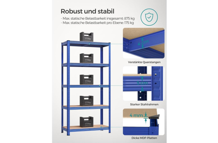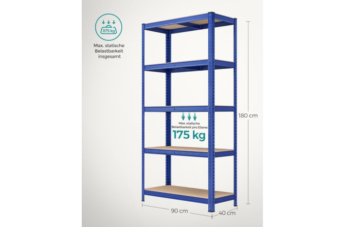 [Dimenzija, zmogljivost] Regal je velikosti 40 x 90 x 180 cm lahko nosi do 875 kg. Uporabite ga lahko v garaži, shrambi ali kleti za organizacijo vsega,... orodja in opreme.