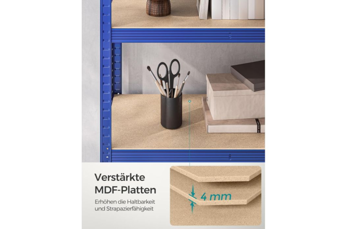 Časovna uporabnost in nosilnost: regal je izdelana iz jeklenega okvirja, vsaka polica lahko zdrži do 175 kg. S priloženo zaščito za nagib lahko polico pritrdite na steno, zato je bolj stabilna in varna.