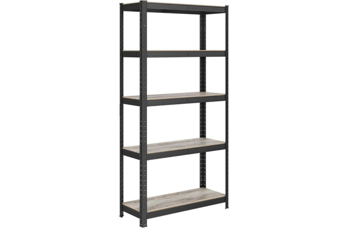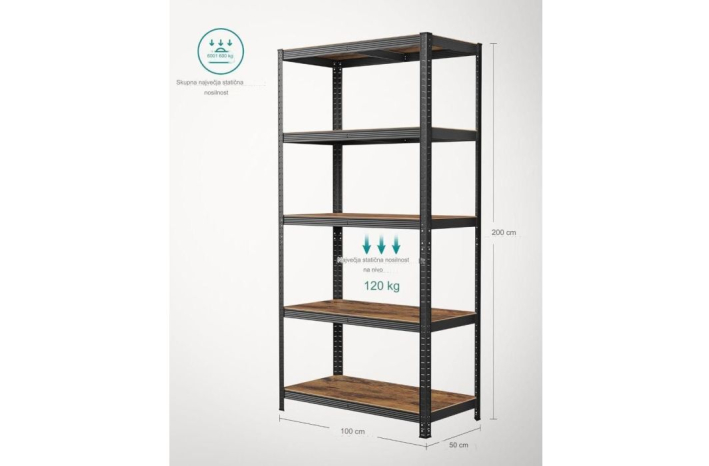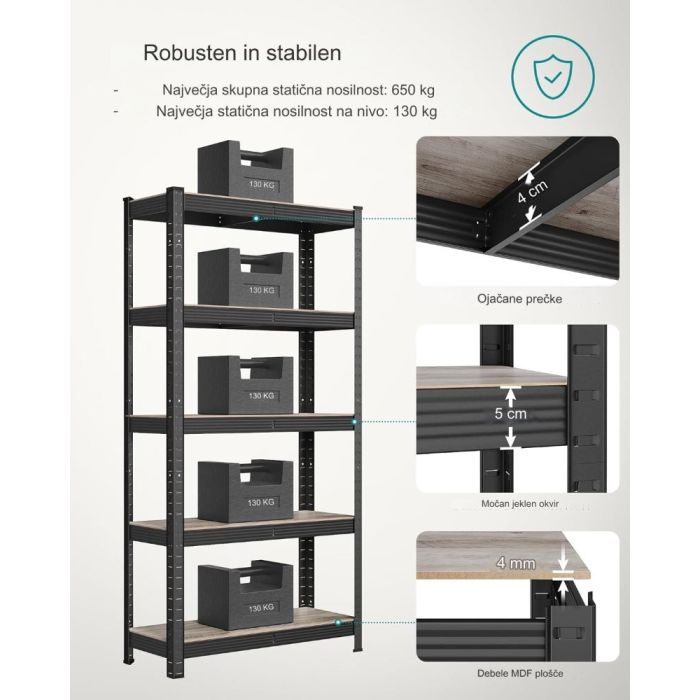 Podrobnosti o izdelku:Barva: naravna črnaMaterial: prašno lakirano jeklo, MDF (vlaknena plošča srednje gostote)Velikost posamezne police: 150 x 75 x 30 cm (v x d x š)Teža posamezne police: 8,1 kgMaksimalna statična nosilnost posamezne police: 120 kg