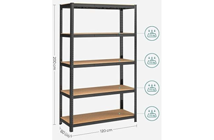 Regalna enota z dimenzijami 60 x 120 x 200 cm in skupno nosilnostjo 875 kg se lahko uporablja v garaži, skladišču, kleti ali gospodarskem prostoru za organizacijo vsega orodja in opreme