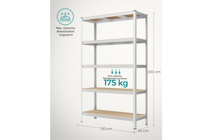 Ta regal velikosti 60 x 120 x 200 cm lahko nosi do 875 kg. Uporabite ga lahko v garaži, shrambi ali kleti za organizacijo vsega orodja in opreme.