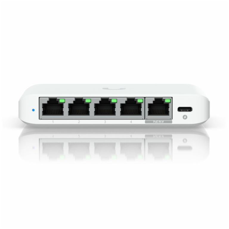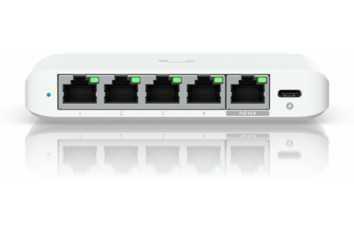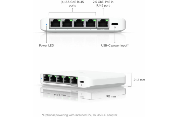Paket vsebuje: 1x Ubiquiti stikalo 5-port 2,5Giga Unifi USW-Flex-2.5G-5, 1x 5V USB-C adapter, 1x Navodila