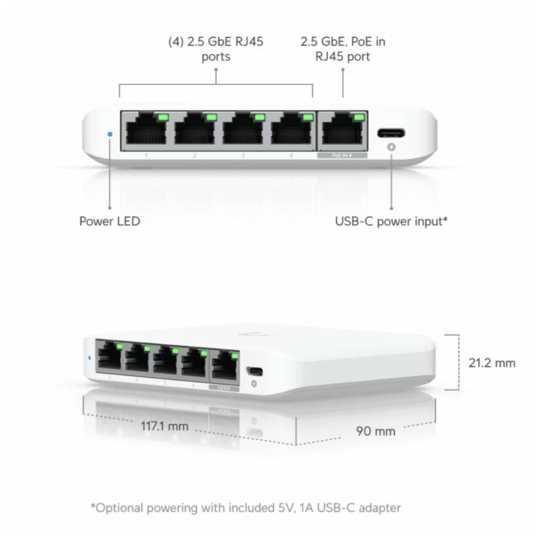 Ubiquiti UniFi Switch Flex Mini 2.5G (USW-Flex-2.5G-5) je kompakten in zmogljiv 5-portni stikalo, zasnovano za visokohitrostna omrežja v domačih in pisarniških okoljih. Opremljen je s štirimi 2,5-gigabitnimi Ethernet vrati ter enim 2,5-gigabitnim PoE vhodnim vrati. Napravo lahko napajate preko PoE vhodnega porta ali z uporabo priloženega USB-C adapterja, kar omogoča prilagodljivo namestitev v različnih okoljih. Stikalo ima preklopno kapaciteto 25 Gbps in hitrost posredovanja 18,6 Mpps, kar omogoča hitro in učinkovito obdelavo podatkovnega prometa.