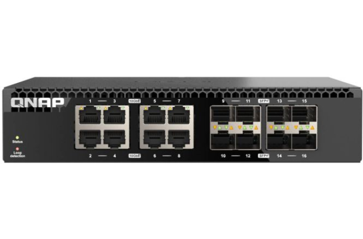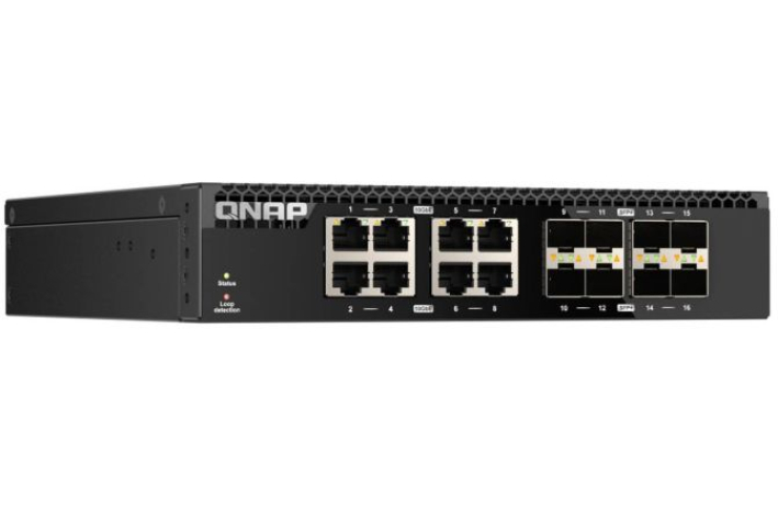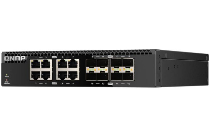 QNAP QSW-3216R-8S8T je neupravljano stikalo polovične širine za namestitev v omaro z osmimi optičnimi vrati 10GbE SFP+ in osmimi vrati 10GbE RJ45.