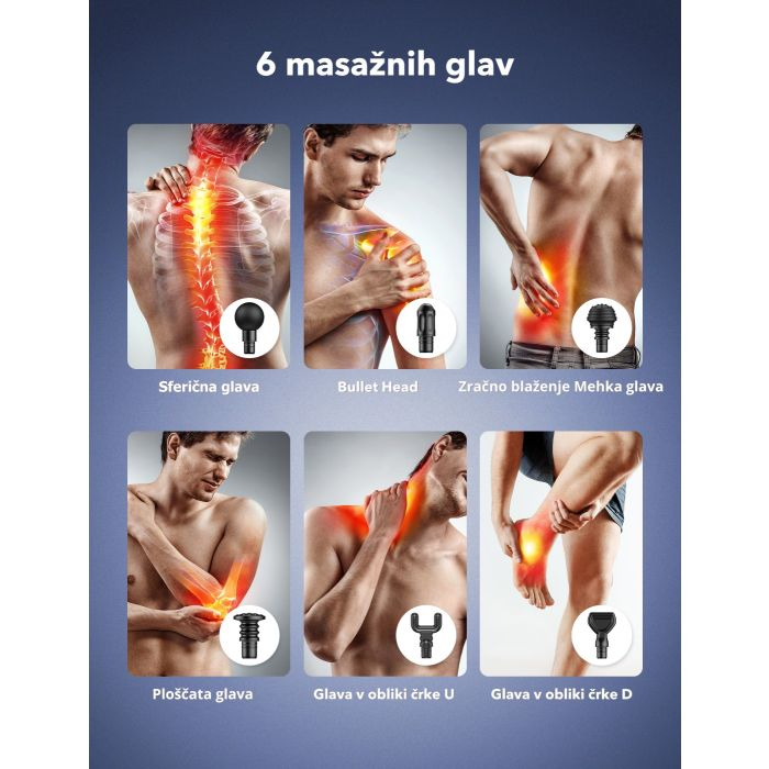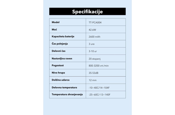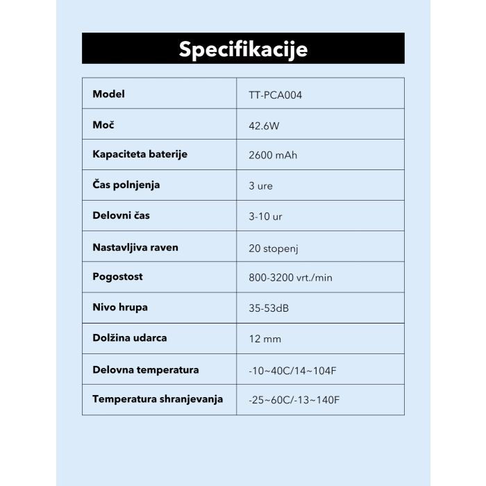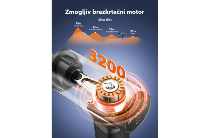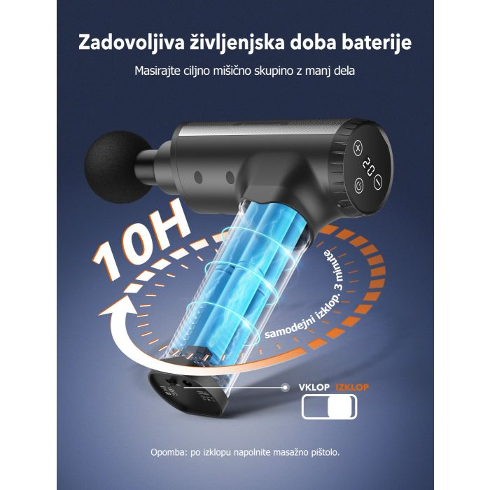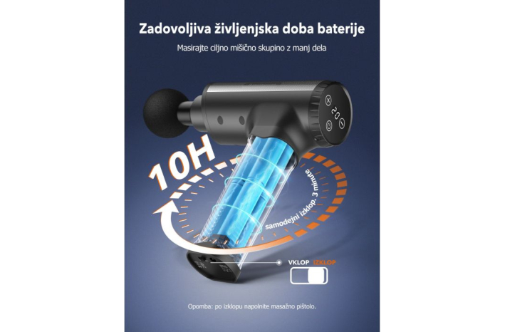 Masažna pištola deluje do 10 ur in po 3 minutah mirovanja samodejno preide v stanje spanja, po 15 minutah mirovanja pa se samodejno izklopi. S tem preprečuje neželeno pregrevanje naprave.