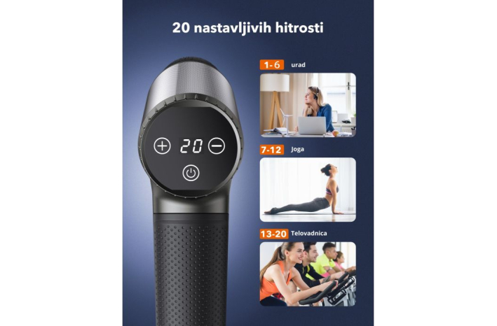 Uporaba in upravljanje masažne pištole sta izjemno enostavni. Hitrost izbirate z gumbi na dotik, izbrane nastavitve stopnje delovanja in stanje baterije pa enostavno spremljate s pomočjo LED prikazovalnika. Za enostavnejše shranjevanje in prenašanje ima priloženo potovalno torbico.
