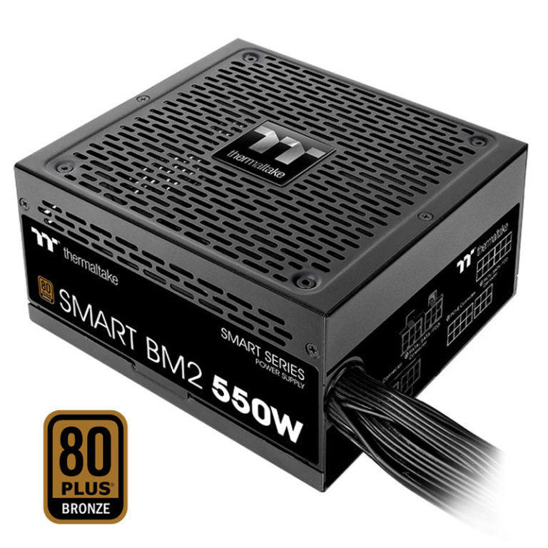 Napajalnik THERMALTAKE Smart BM2 550W - TT Premium Edition je zasnovan za doseganje 80 PLUS Bronze učinkovitosti do 85%. S 140mm ventilatorjem na puškarskih ležajih in japonskimi glavnimi kondenzatorji zagotavlja stabilen izhod moči pri 40?.