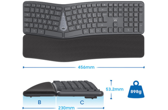 Tipkovnica s svojo ukrivljeno zasnovo omogoča naravno držo med tipkanjem ter zmanjšuje napetost v zapestjih in v podlakti.