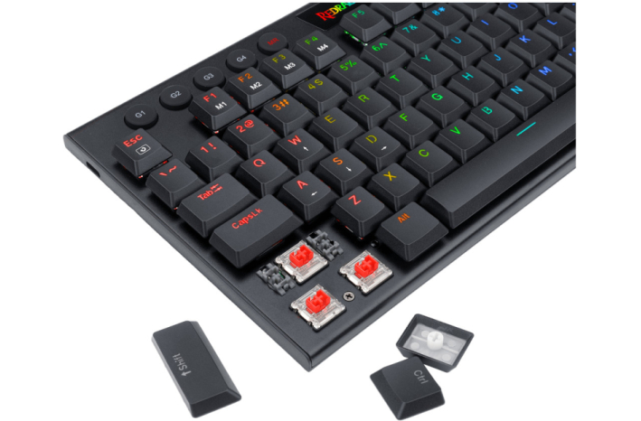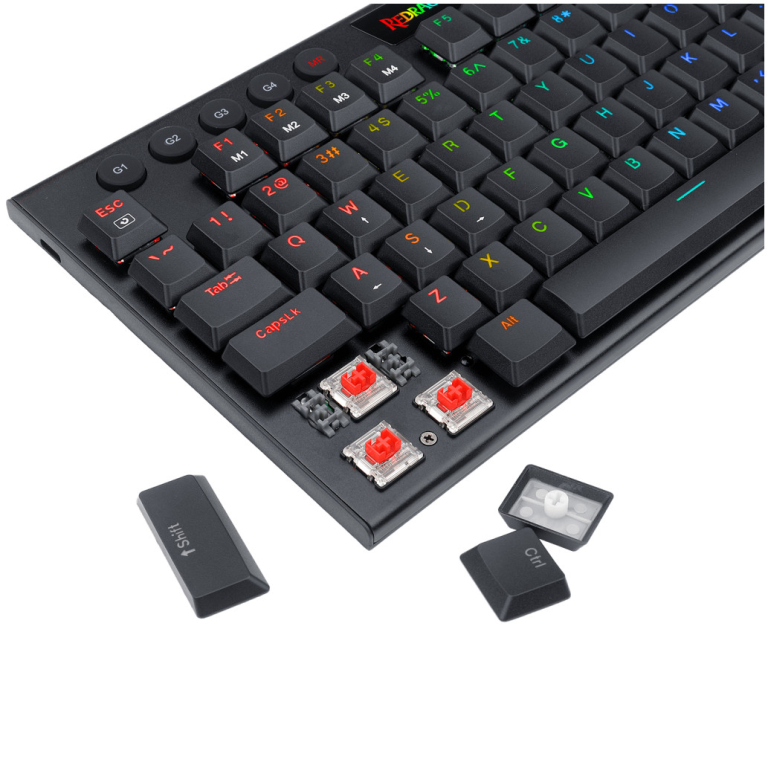 Vrh tipkovnice je oblikovan nizkoprezno, od spodnje plošče, preko srednjih nizkopreznih rdečih stikal (sprožitvena sila: 40 g) do zgornjih pokrovčkov tipk, kar maksimalno zmanjšuje razdaljo do sprožitve.