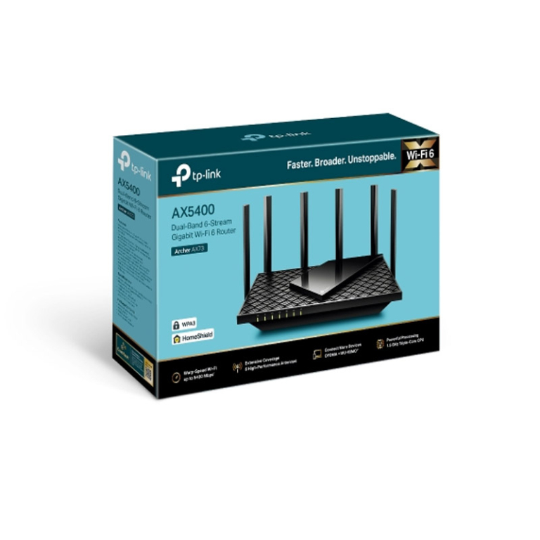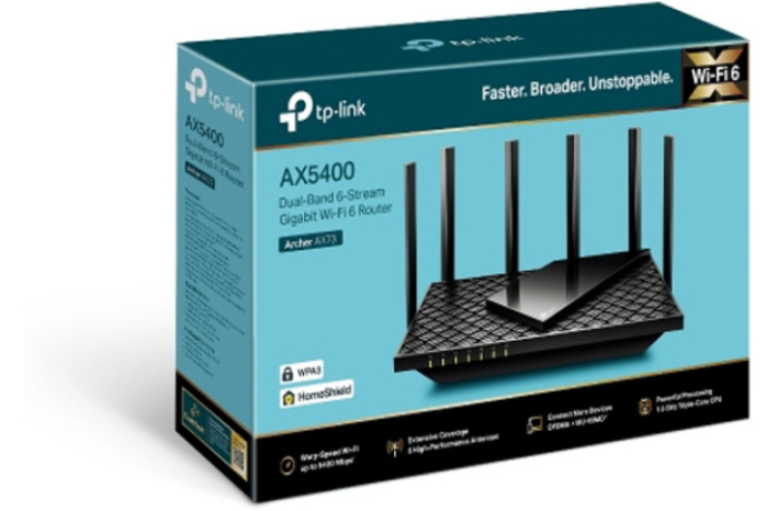 Usmerjevalnik-router TP-LINK Archer AX73 AX5400 Dual Band Gigabit Wi-Fi 6 je opremljen s tehnologijo Wi-Fi 6 in omogoča hitrosti do 5400 Mbps. Zagotavlja brezžično pokritost za več kot 200 naprav. Varnostne storitve HomeShield ščitijo omrežje. Enostavna namestitev z aplikacijo Tether.