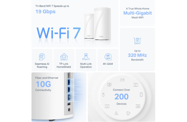 Izkusite vrhunski tripasovni sistem WiFi 7 Mesh za celoten dom z bliskovito hitrimi hitrostmi WiFi do 19 Gbps. Zdaj bo vsaka naprava v vašem domačem omrežju delovala z vrhunsko zmogljivostjo. Ekskluzivni 6 GHz pas zagotavlja izjemno pasovno širino in kanale brez preobremenitve, izključno za vaše naprave.