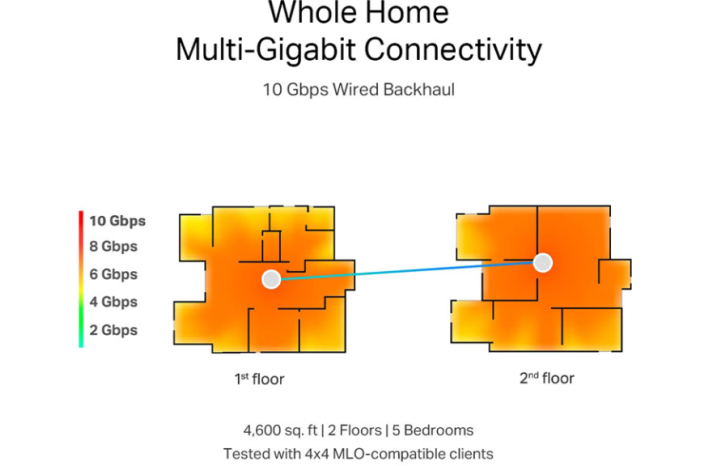 Deco BE85 v prvem nadstropju ostaja enak kot pri žičnem omrežnem prenosu. Zaradi sten in stropa med nadstropjema pa središče drugih Deco BE85 prejme približno 3,5 Gbps , medtem ko hitrost preostalega dela hiše doseže 3-3,5 Gbps