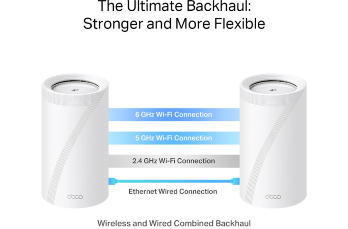 Z našo lastno razvito tehnologijo lahko Deco BE85 hkrati poveže brezžično in žično backhaul z vsako enoto. Še več, z najnovejšo tehnologijo WiFi 7 MLO se poveča pretok kombiniranega brezžič nega in žičnega backhaul omrežja sistema. Na ta način se močno izboljša skupna prepustnost in zmanjša zakasnitev, kar zagotavlja širšo pokritost s stabilnejšimi in zanesljivejšimi povezavami.