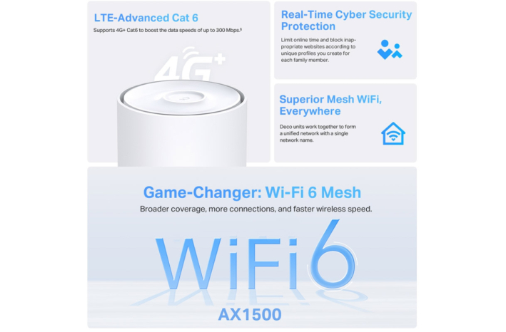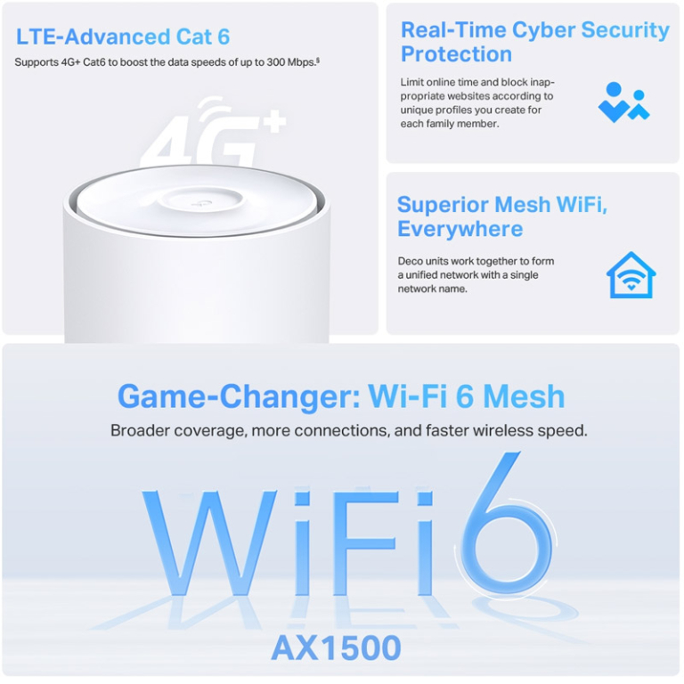 Prehod Deco X10-4G podpira Cat6 s hitrostjo internetne povezave navzdol do 300 Mbps, ki si jo deli super hitri WiFi 6 s hitrostjo do 1,5 Gbps, kar omogoča spletne dejavnosti brez zamikov, kot so pretakanje 4K, igranje v oblaku in video klici. Priključite kartico SIM in uživajte v hitrem internetu.