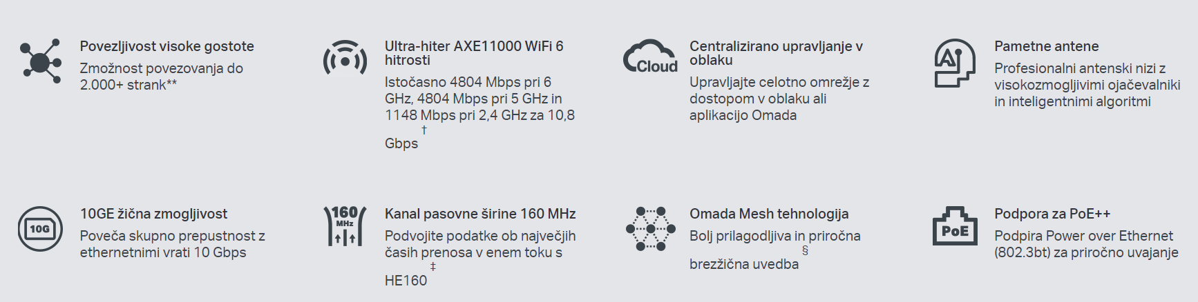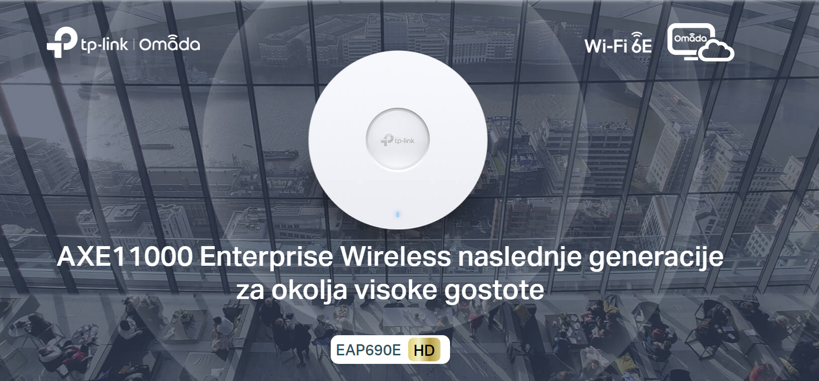 EAP690E HD AXE11000 ponuja izjemno hitrosti Wi-Fi 6E, povezljivost visoke gostote do 2000 odjemalcev in 10G žično povezavo za izjemno zmogljivost v poslovnih okoljih.