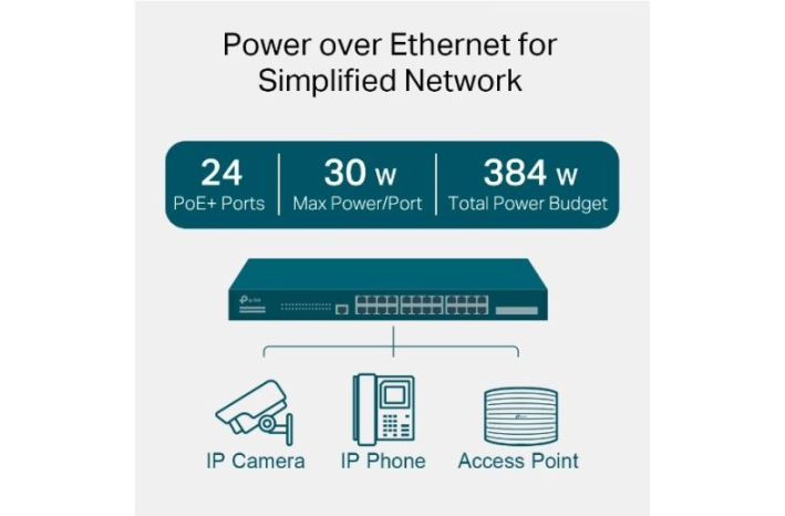384 W Proračun PoE: 24 × 802.3at/af-združljivih PoE+ vrat s skupno močjo 384 W*.