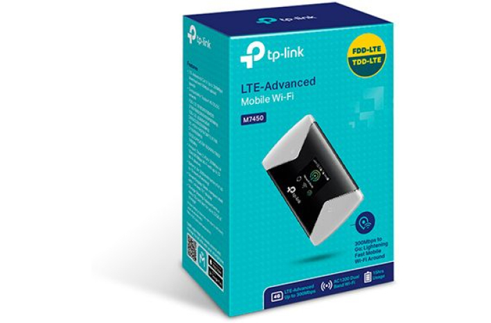 TP-LINK M7450 omogoča deljenje 4G/LTE povezave. Plug and play, samo vstavite 4G SIM kartico v napravo in takoj ustvarite dual band Wi-Fi hotspot. Do 300Mbps prenosa navzdol in 50Mbps navzor omogoča deljenje povezave do 32 uporabnikom naenkrat. Priročna žepna velikost in močna 3000mAh notranja baterija omogoča do 15 ur delovanja. Z 1,44" TFT zaslonom lahko uporabnik spremlja stanje moči signala, tip omrežja (4G/3G/2G), Wi-Fi status, internet, statistiko in stanje baterije.