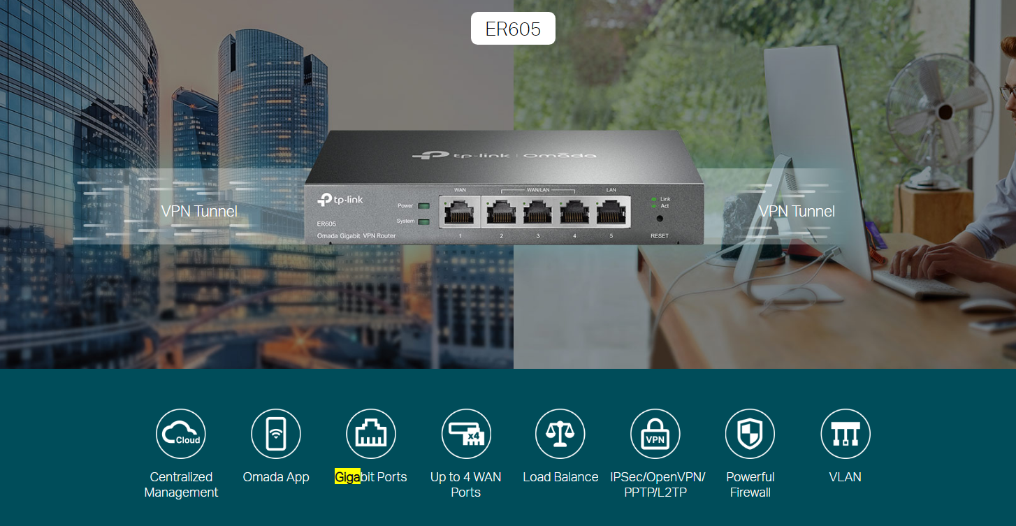 Usmerjevalnik TP-LINK Omada ER605 (TL-R605) je zasnovan za zagotavljanje visoke hitrosti in varnosti omrežja. S štirimi WAN priključki in integriranimi VPN protokoli je idealen za majhna in srednje velika podjetja ter hotele.
