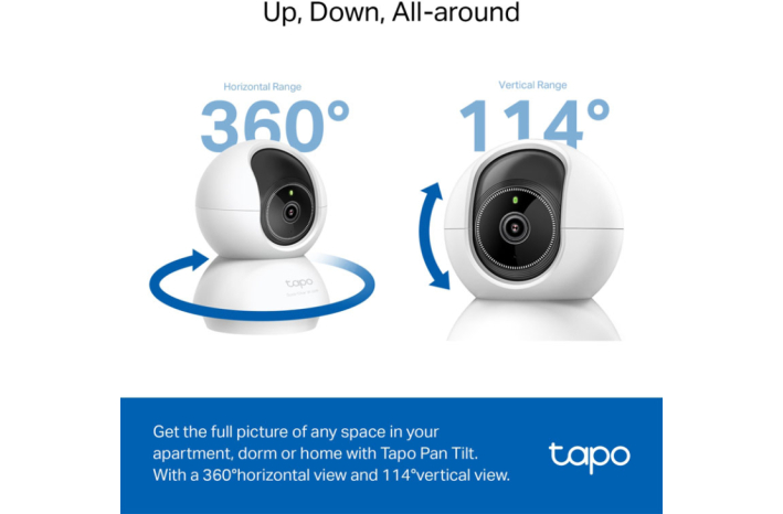 - Širok razpon gibanja: Uživajte v polnem 360-stopinjskem vodoravnem in 114-stopinjskem navpičnem razponu za panoramsko in nagibno premikanje, kar vam omogoča, da pokrijete večjo površino.