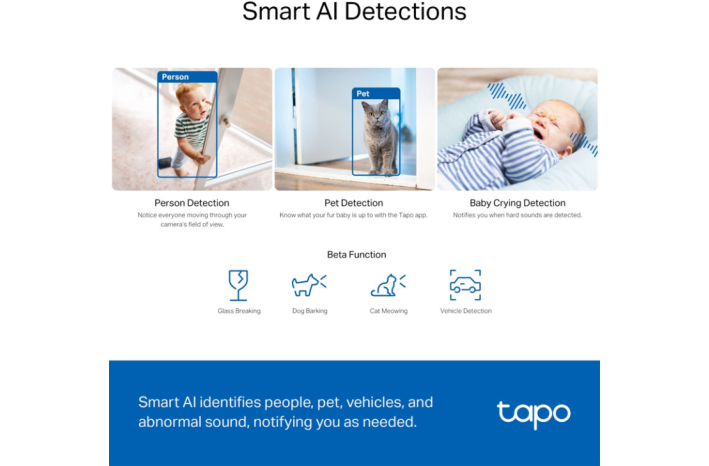 Pametna umetna inteligenca prepoznava ljudi, hišne ljubljenčke in vozila, hkrati pa prepoznava otroški jok in druge zvoke ter po potrebi obvešča uporabnike.