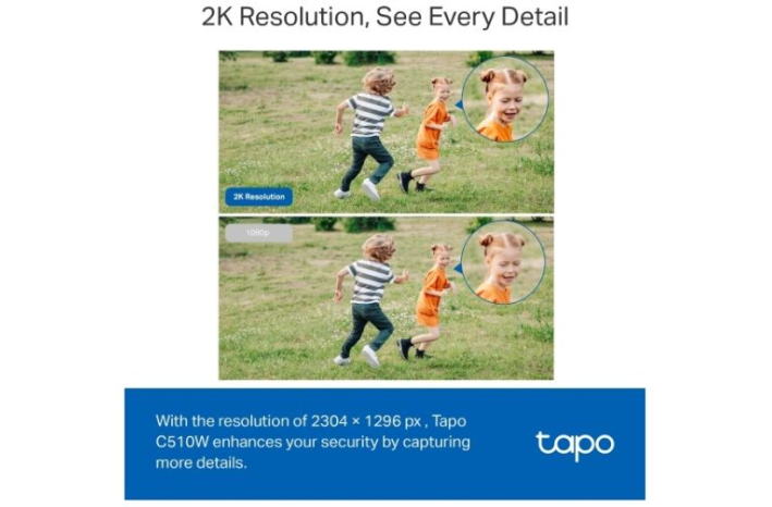 Ločljivost 2K - Z ločljivostjo 2304 × 1296 slikovnih pik Tapo C510W izboljša vašo varnost z zajemom več podrobnosti v primerjavi s tradicionalno ločljivostjo 1080p (1920 × 1080 slikovnih pik).