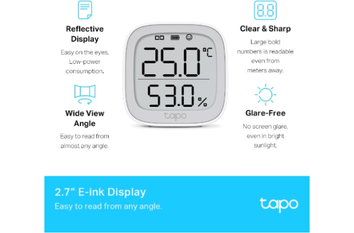 2,7-palčni zaslon z e-črnilom – prikazuje temperaturo in vlažnost, raven udobja z obrazno mimiko, stanje baterije in signal.